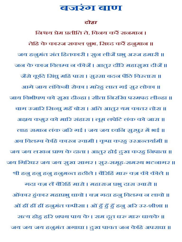 Bajrang Baan Pdf Download - जन के काज बिलंब न कीजै। आतुर दौरि महा सुख दीजै॥ जैसे कूदि सिंधु महिपारा। सुरसा बदन पैठि बिस्तारा॥ आगे जाय लंकिनी रोका। मारेहु लात गई सुरलोका॥ जाय बिभीषन को सुख दीन्हा। सीता निरखि परमपद लीन्हा॥ | shri bajrang ban, lord hanuman, lord saturn, saturn, troubleshooter hanuman, ramrcshastrot, tue planet.